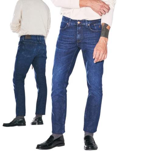 Jeans con vestibilità slim, tessuto denim leggermente elasticizzato che garantisce il massimo del comfort, totale libertà di movimento e un eccellente ritorno di forma. Il pantalone ha chiusura con zip, ha un richiamo alla lavorazione iconica del disegno toppa ed è dotato di metalleria logata in colore ottone e cuciture colore tabacco, tipiche del mondo denim. La salpa è in pelle tinta in colore testa di moro cerata manualmente. Il lavaggio dall’aspetto scuro  con lievi sabbiature.