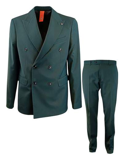 Abito realizzato in tessuto misto tecnico, molto leggero e traspirante dalla vestibilità regolare. La giacca è doppio petto con rever a lancia, fodera interna con tasche e spacchi laterali posteriori; il pantalone ha una vestibilità regolare con tasche chino e punto vita con zip e bottone.
