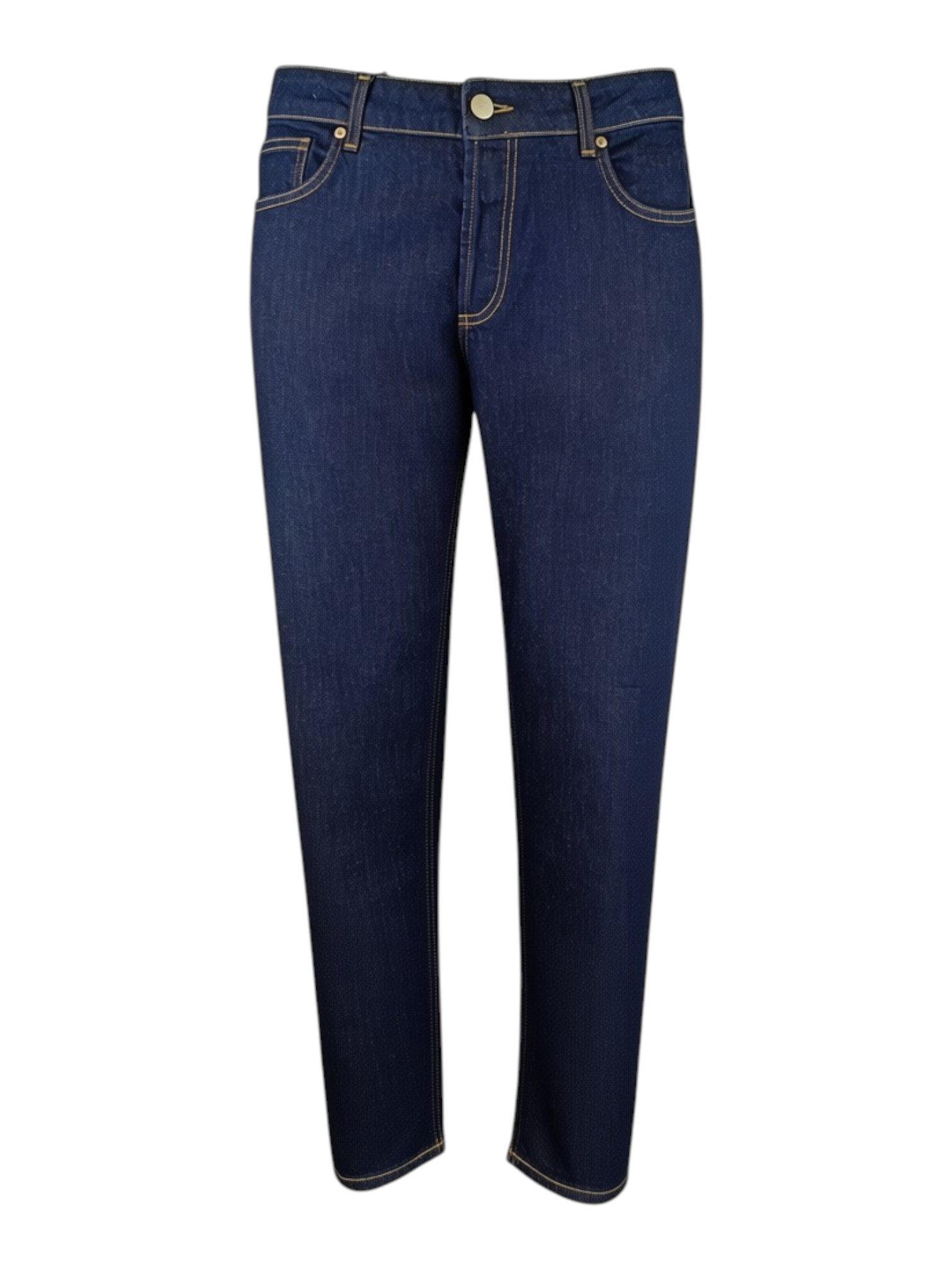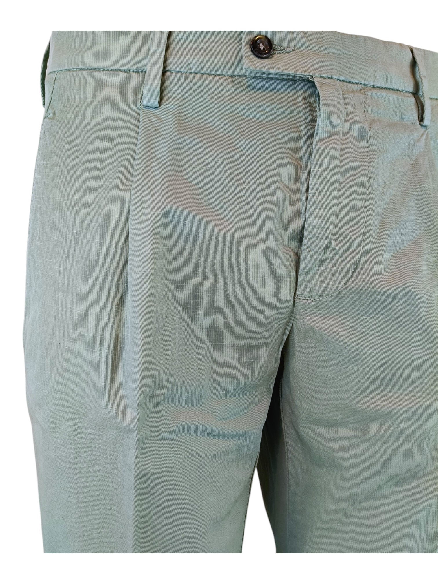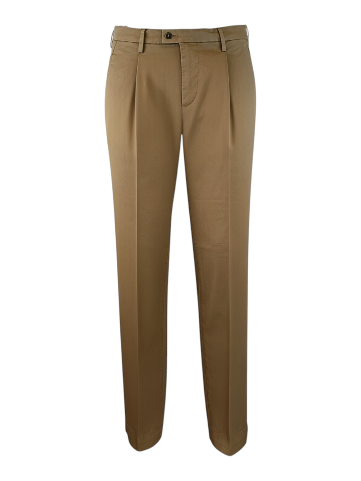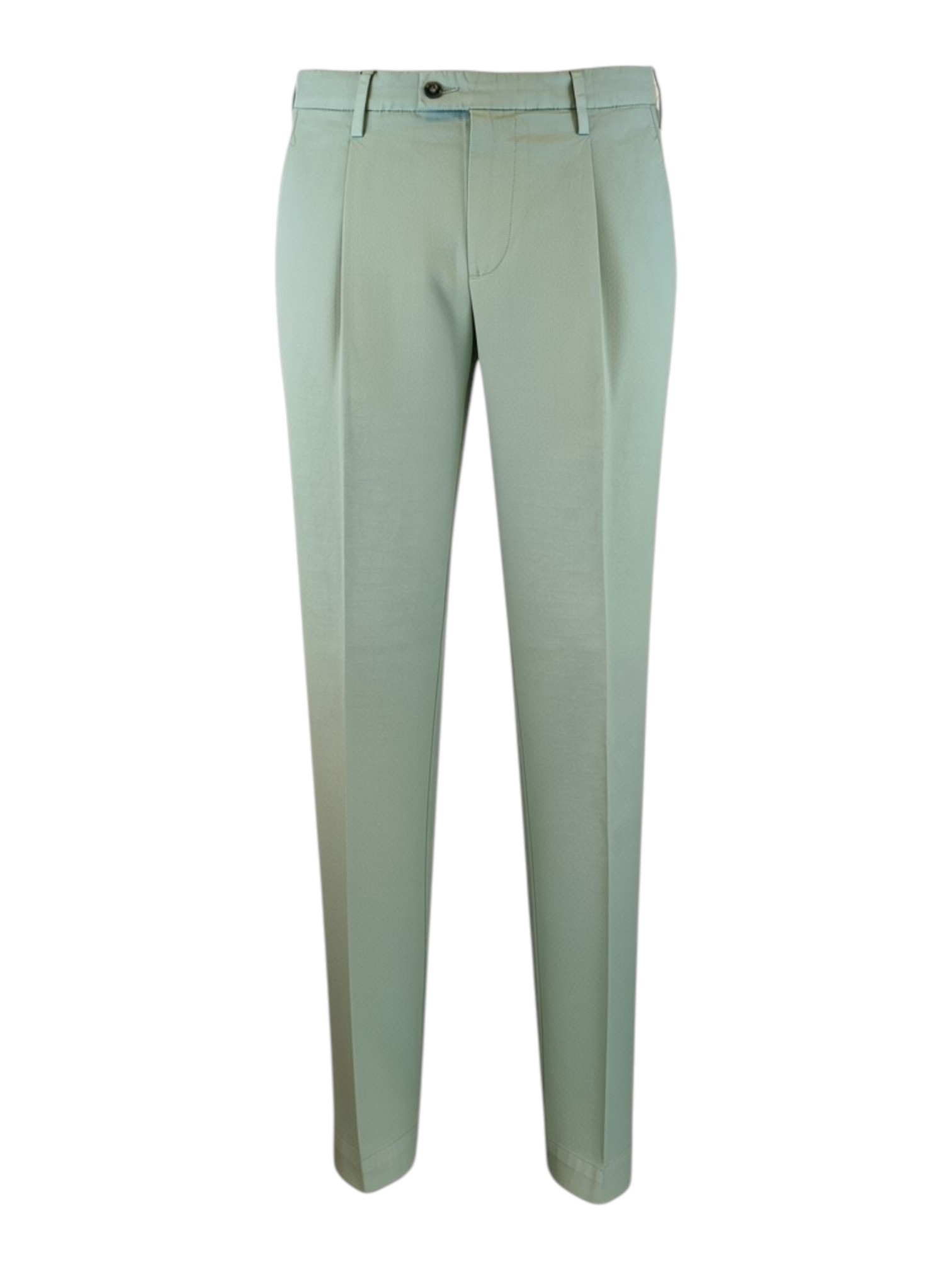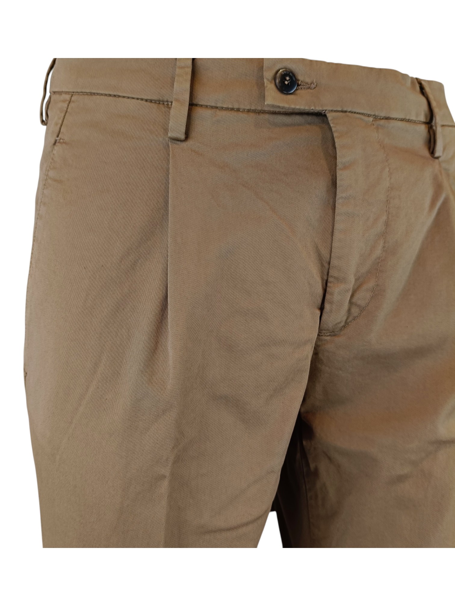 Pantalone realizzato in gabardina leggera di cotone dalla gamba leggermente comoda. Altezza vita intermedia, chiusura zip e bottoni, tasche posteriori con pattina. Lunghezza gambe sopra scarpe.