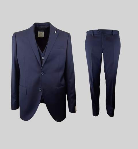 Capo di altissima qualità realizzato in sallia di pura lana. L'abito è completo di gilet. La giacca presenta spacchi laterali posteriori, fodera e tasche interne con bottonatura sul davanti a due bottoni. Il pantalone presenta tasche chino e su quelle posteriori bottoni, punto vita con zip e bottoni. Vestibilità regolare.