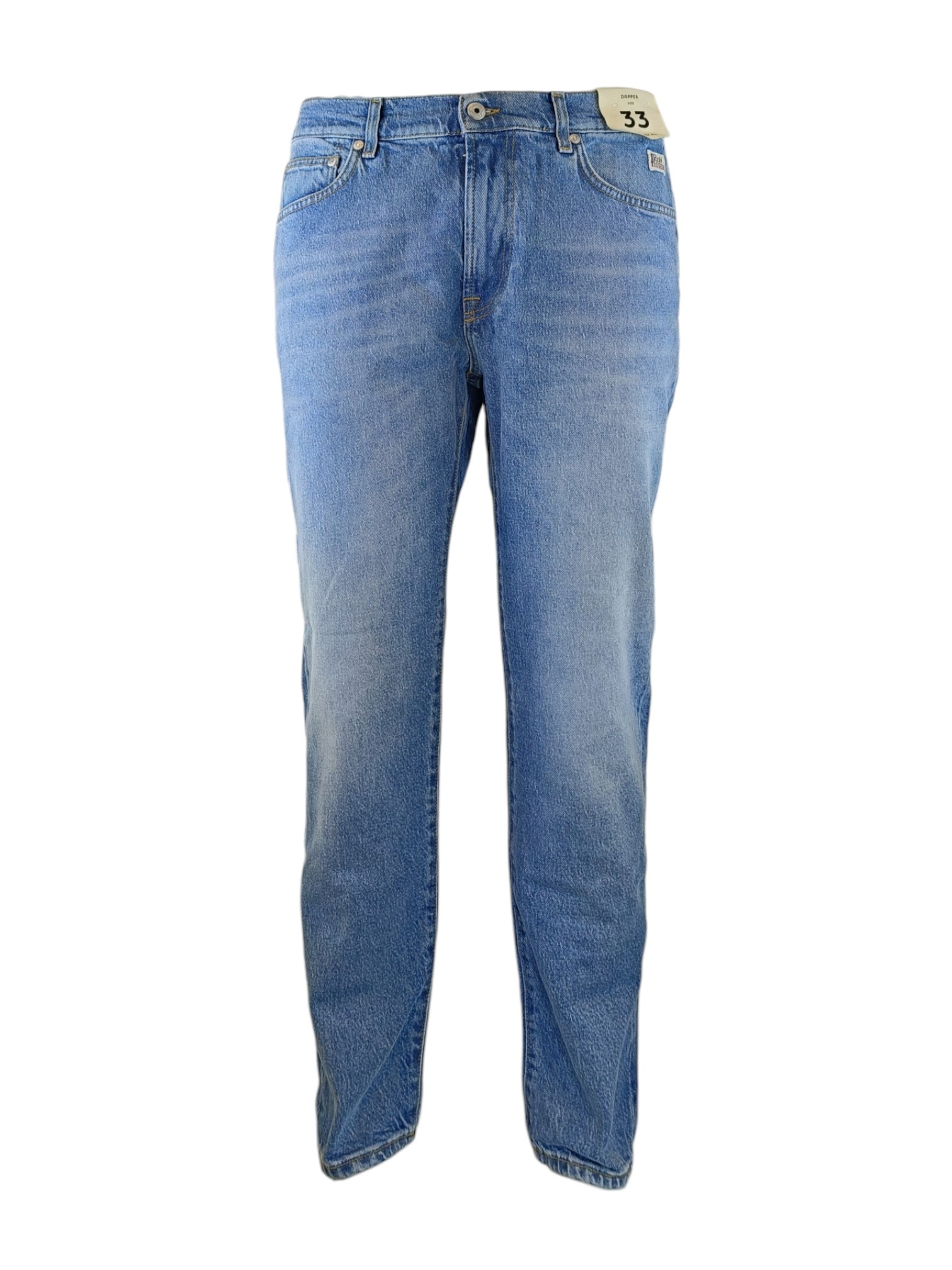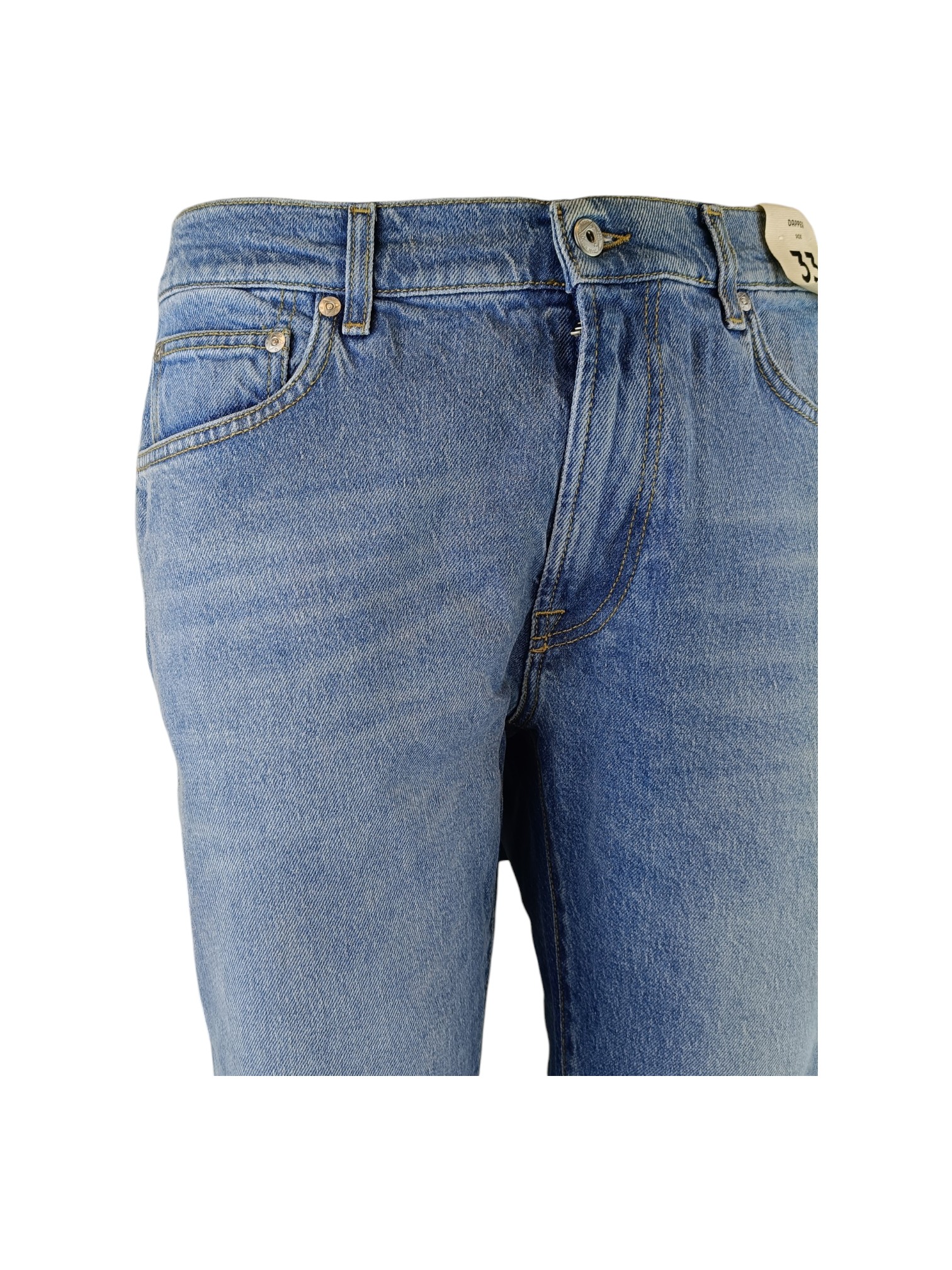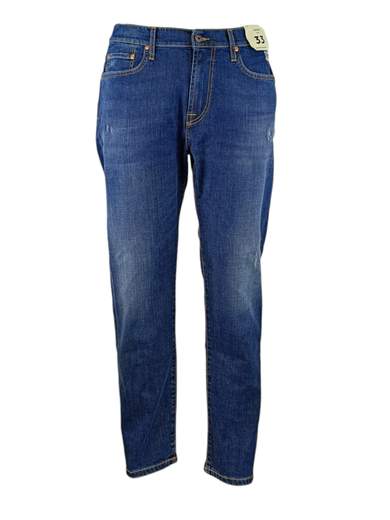 Jeans modello dapper di Roy Roger's dalla vestibilità leggermente morbida; lunghezza gambe sopra scarpe. Vestibilità carrot. Punto vita con zip e bottone. Tessuto denim leggero lavaggio stone washed con piccole rotture.